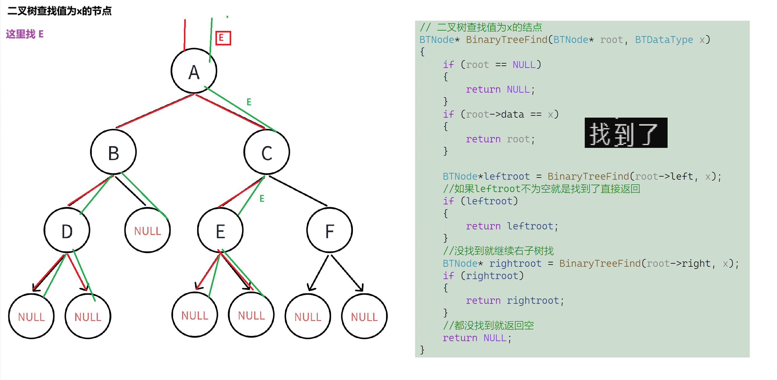 --递归查找,找到了就返回当前节点,如果是在左子树中找到就直接返回,没找到继续来到右子树找,最好都没找到就返回NULL