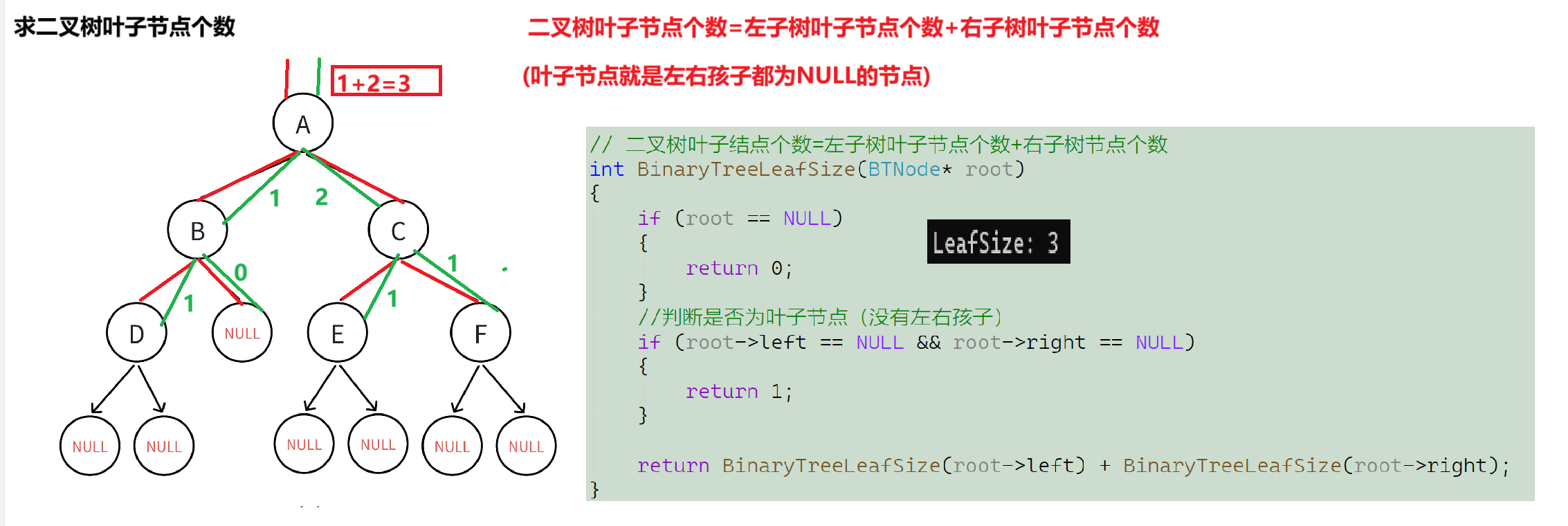 // 二叉树叶子结点个数=左子树叶子节点个数+右子树节点个数