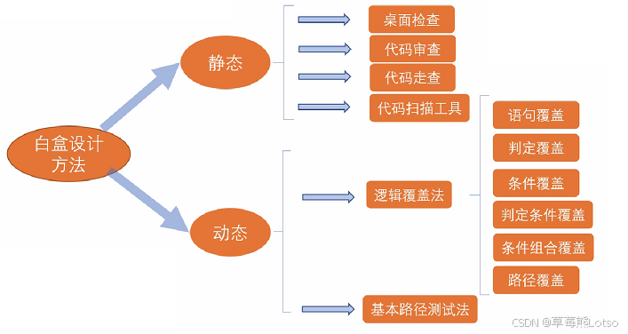 白盒测试主要分为静态测试和动态测试两种。静态测试常见于桌面检查,代码审查,代码走查,代码扫描工具,动态测试方式主要包含六种测试方法:语句覆盖,判断覆盖,条件覆盖,判定条件覆盖,条件组合覆盖,路径覆盖。