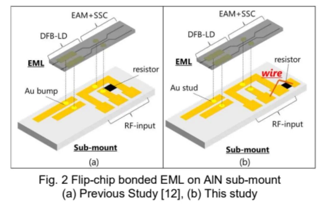 为解决这些痛点,在ECOC 2025上,三菱提出了一款基于倒装键合flip chip技术的EML,并通过打线峰化设计将其带宽进一步提升至110GHz,为高速IM-DD(强度调制直接检测)应用提供了全新方案。