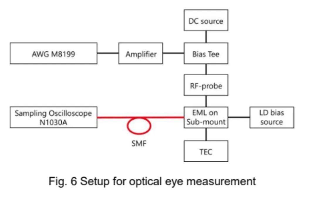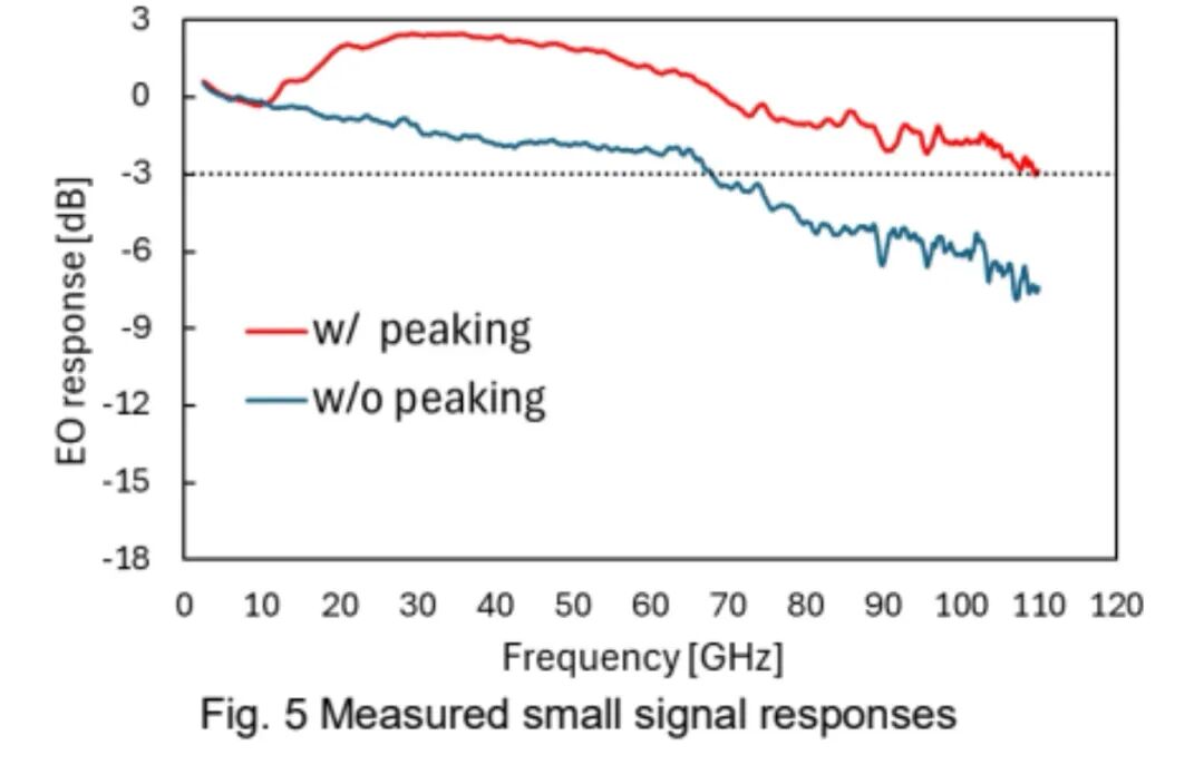 小信号响应测试中,无峰化设计的样品3dB带宽约为66GHz,而引入峰化导线后,3dB带宽跃升至110GHz,创下倒装键合EML的带宽纪录。
