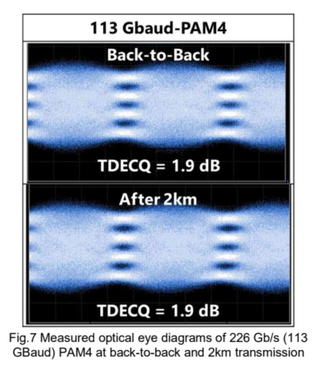 测试结果显示,在背靠背配置下,TDECQ为1.9dB,消光比(ER)为4.8dB;即便经过2km传输,TDECQ仍保持1.9dB,表明该EML在2km传输距离内几乎无性能损失。