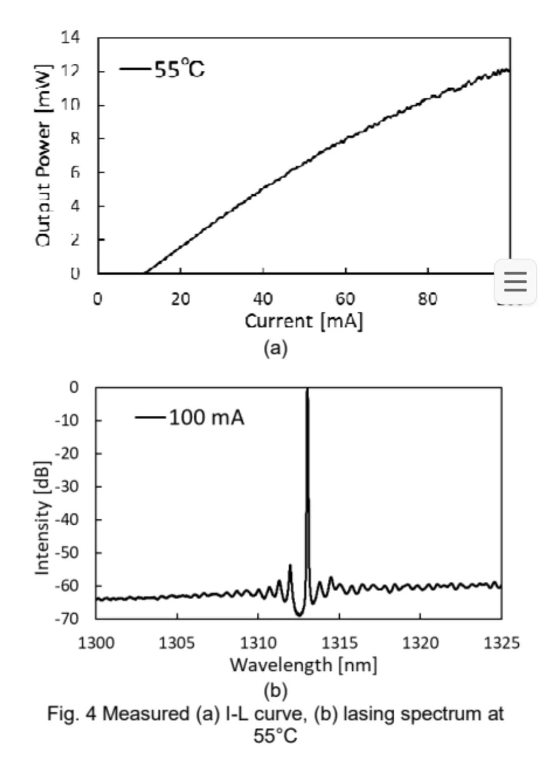 在发光特性方面,对DFB-LD的I-L曲线和光谱测试显示:当LD电流为80mA、温度55℃时,未出现输出饱和或扭结现象,边模抑制比(SMSR)超过50dB,激射波长为1313.05nm。这表明倒装键合工艺未对激光器的激射特性造成显著劣化。