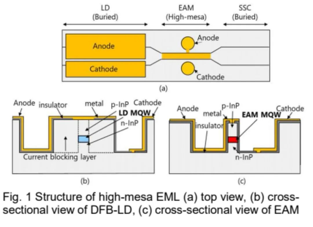 该EML基于氮化铝(AlN)基板采用倒装焊集成,单芯片内整合了掩埋式DFB-LD(用于提供高光学输出功率)、电吸收调制器(EAM) 以及光斑转换器SSC(提升光纤耦合效率)。