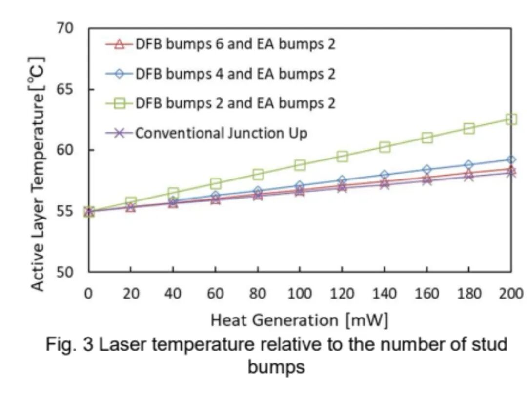 由于散热仅依赖金凸点,需对其热特性进行深入研究。通过数值模拟,团队构建了AlN基板上倒装键合EML的模型(AlN厚度500μm,搭载于0.95μm厚的CuW载体上,金凸点直径60μm、高度20μm),模拟了不同凸点数量下的激光温度变化。