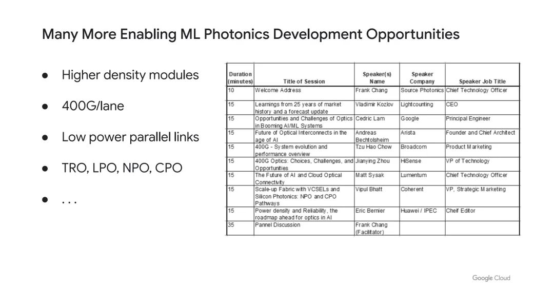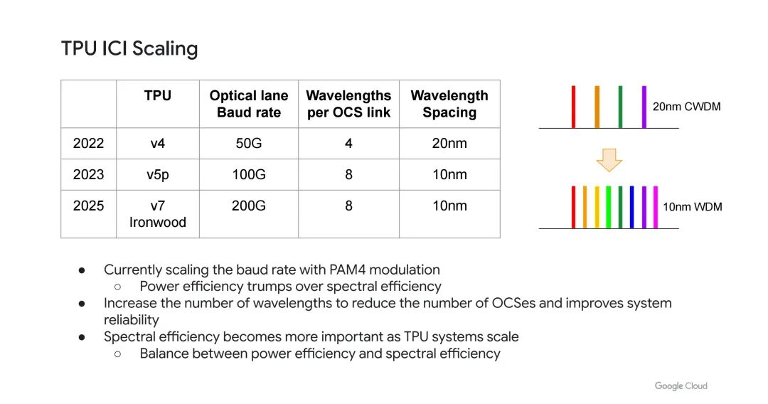 为匹配TPU系统的规模化需求,光互连的波特率、波长数量与波长间距持续迭代:
