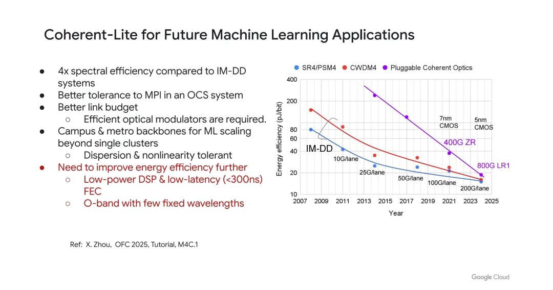 不过,相干系统要应用于数据中心内部的ML系统,仍需解决三大问题:一是进一步提升能量效率,需开发低功耗数字信号处理器(DSP);二是降低前向纠错(FEC)延迟,要求延迟低于300ns;三是需设计O波段(O band)相干系统,采用少量固定波长,以更好地支持OCS系统的规模化。