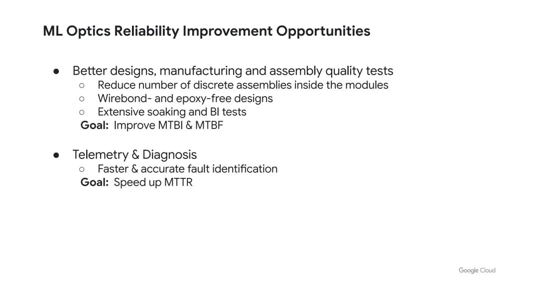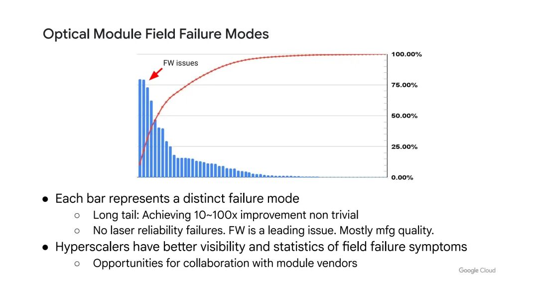 从故障模式来看,光模块的故障类型超过100种(呈现“长尾分布”),实现10倍或100倍的可靠性提升难度极大。具体故障原因包括:固件问题(主要故障类型之一)、制造质量问题(如组件装配缺陷),而激光可靠性问题尚未出现。此外,光模块内部的绑线(wire bond)与环氧树脂(epoxy)是故障高发点,两者导致的故障在模块故障中占比显著。