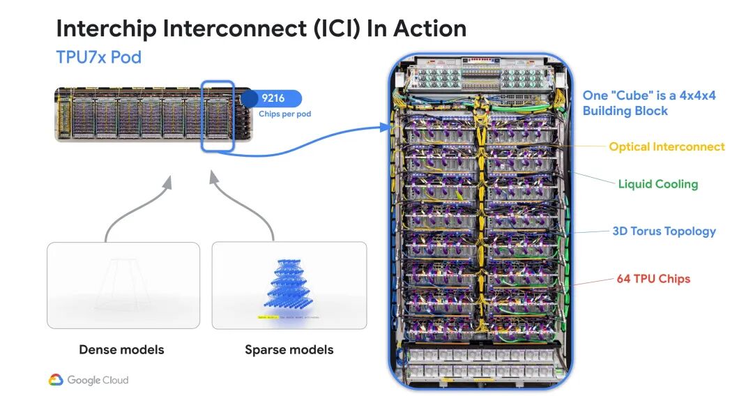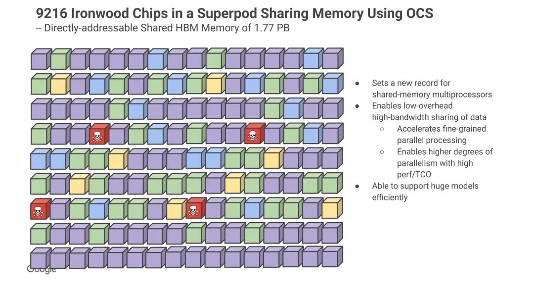 - 2025年TPU v7(代号Ironwood):超级集群芯片数达到9216颗,保持3D环面拓扑与1200GB/s的单芯片ICI带宽,采用800G OSFP光模块,光通道波特率提升至200G,同时实现1.77PB的直接寻址共享高带宽内存(HBM),创下共享内存多处理器的新纪录,可高效支撑稠密模型与稀疏模型。