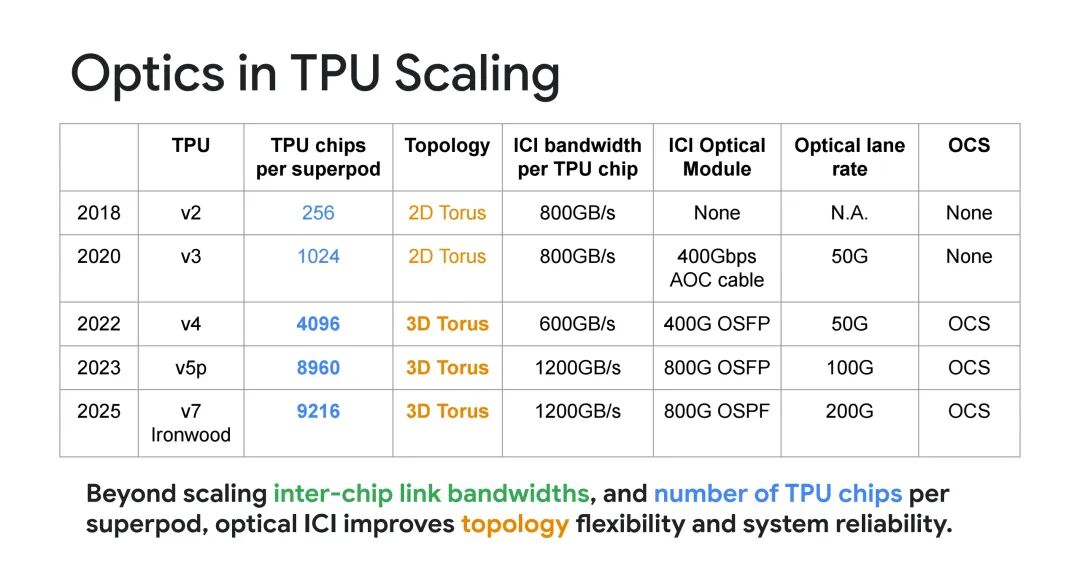 自2018年TPU v2起,Google逐步将光互连技术融入TPU系统,每一代产品均在芯片规模、拓扑结构与光互连参数上实现突破:
