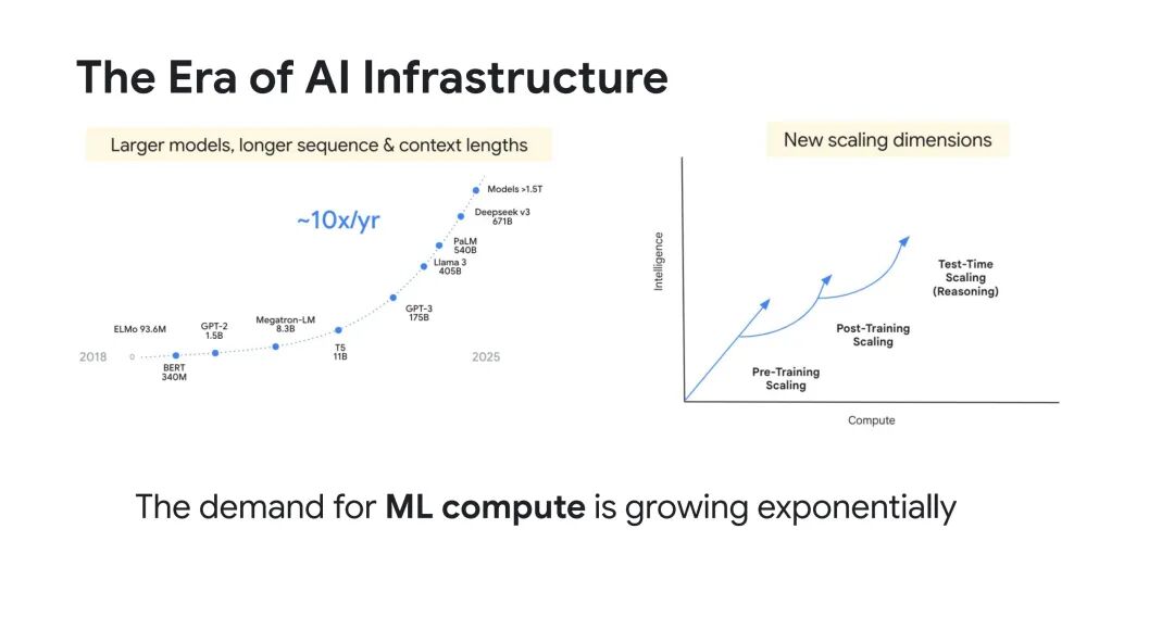 当前,AI与机器学习(ML)需求呈指数级增长:一方面,模型规模以每年超10倍的速度扩张,从2018年BERT的9360万参数、GPT-2的15亿参数,发展至如今超1.5万亿参数的模型(如Deepseokv3、Llama3等),且增长趋势无放缓迹象;另一方面,ML系统的规模化维度不断拓展,除了模型预训练阶段的规模需求,后续的训练后推理、测试时推理(如学习模型的推理任务)均对基础设施提出更高要求。