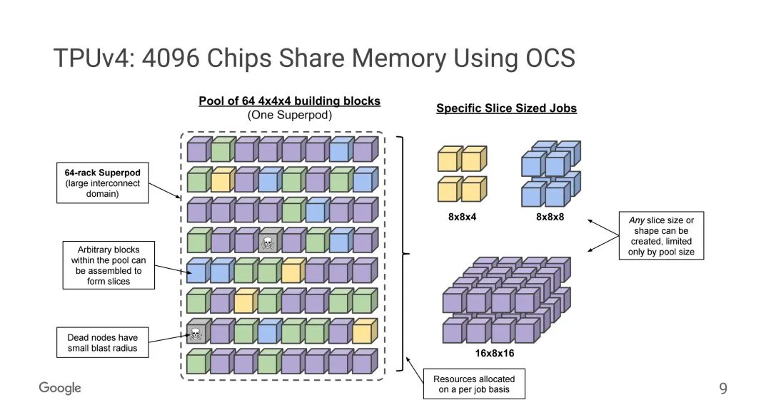 - 2022年TPU v4:芯片数跃升至4096颗,拓扑升级为3D环面(3D Torus),单芯片ICI带宽调整为600GB/s,光模块升级为400G OSFP,同时引入光交叉连接(OCS),光通道波特率仍为50G;
