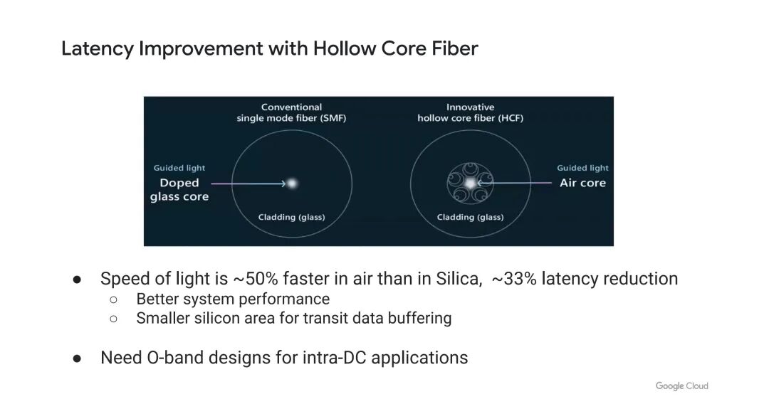 传统单模光纤(SMF)的光信号在掺杂玻璃纤芯中传输,而空心光纤(HCF)以空气为纤芯,光在空气中的传输速度比在硅中快约50%,可减少1/3的延迟预算。这种低延迟特性不仅能提升系统性能,还能减少用于缓冲传输数据的硅芯片面积,适配ML系统对低延迟的需求。不过,空心光纤需采用O波段设计,才能满足数据中心内部(intra-DC)的应用场景。