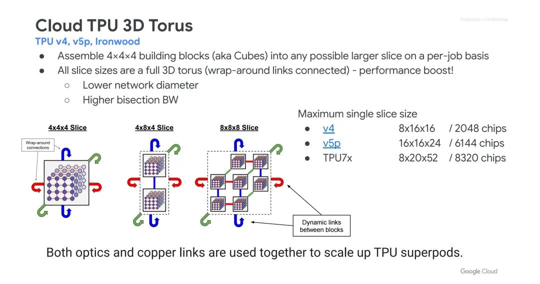 TPU v4、v5p及v7均采用“4×4×4立方体构建块”(Cube)作为核心架构单元:立方体内的TPU处理器通过铜互连(铜ICI)连接,而不同立方体之间则通过光互连实现拼接。这种设计可根据任务需求,将多个立方体动态组合成任意尺寸、任意形状的“切片”(slice),且所有切片均为完整的3D环面结构——通过光互连实现“环绕链路”(wrap-around links)连接,既能降低网络直径,又能提升二分带宽(bisection bandwidth),从而显著优化系统性能。