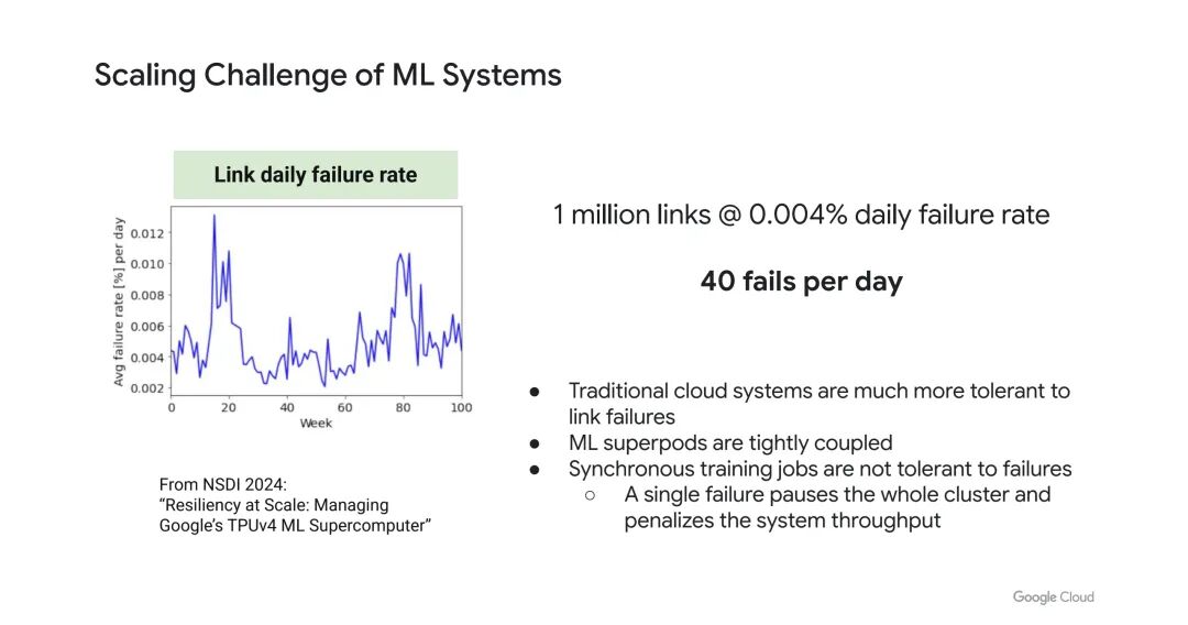 TPU系统的链路故障对ML任务影响显著:以TPU v4为例,其日均ICI链路故障率为0.004%,若系统包含100万条链路,每天将出现约40次故障。与传统云系统不同,ML超级集群是“紧耦合”系统,同步训练任务对故障极不耐受——单次链路故障会导致整个系统暂停,大幅降低系统吞吐量。