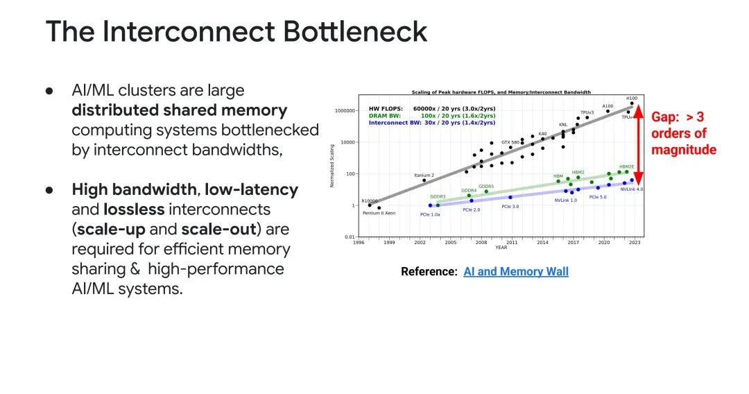 AI/ML集群本质是大型分布式共享内存计算系统,但其发展面临严重的“互连瓶颈”:计算性能的增长速度远超互连性能——过去20年,硬件峰值浮点运算能力(HW FLOPs)增长了6万倍(每2年增长3倍),而内存与互连带宽的增长差距超过3个数量级。