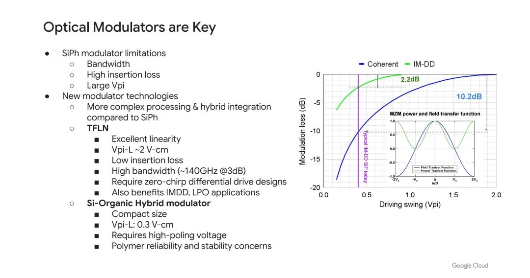 - 薄膜铌酸锂(TFLN)调制器:具备优异的线性度,半波电压-长度乘积(Vpi-L)低至2V·cm,插入损耗小,带宽高(3dB带宽约140GHz),且对直接检测(IM-DD)与低功耗光互连(LPO)系统同样有益。不过,要实现相干传输,TFLN调制器需采用零啁啾差分驱动设计;