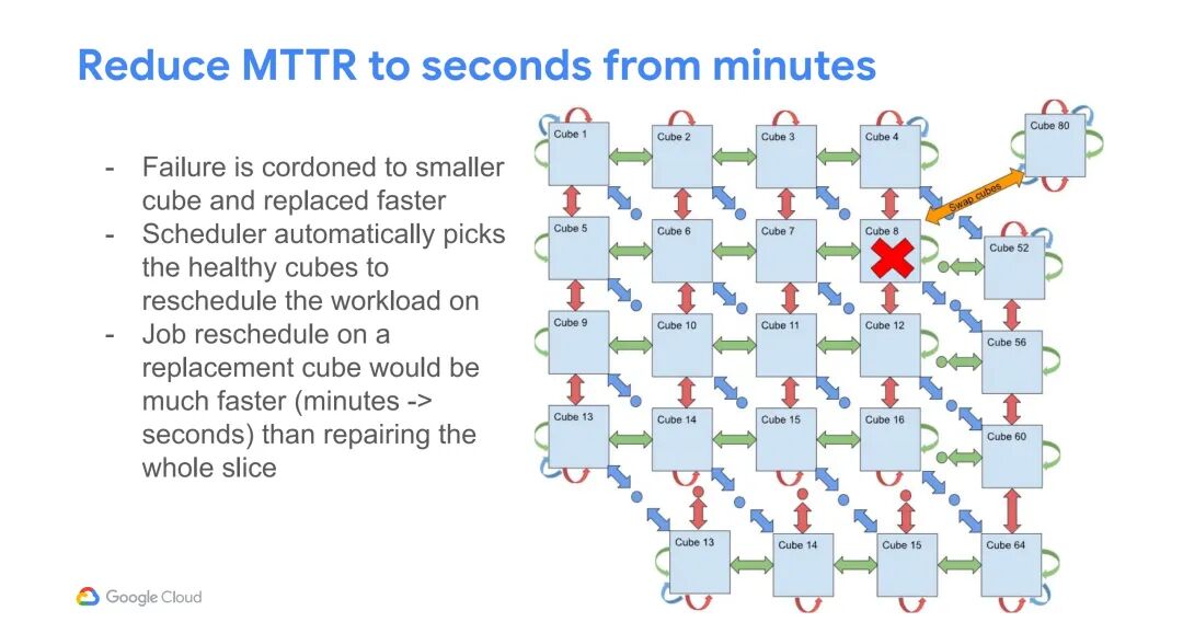 以TPU v4为例,其超级集群由64个4×4×4立方体构建块(对应64个机架)组成,可组合出最大8×16×16(2048颗芯片)的切片;TPU v5p的最大切片尺寸扩展至16×16×24(6144颗芯片);TPU v7则进一步支持8×20×52(8320颗芯片)的切片。此外,该架构将故障域缩小至单个立方体:当某个立方体出现故障时,调度器会自动选择健康的立方体替换故障单元,作业在替换立方体上的重新调度时间从传统的分钟级/小时级缩短至秒级,大幅降低平均修复时间(MTTR),提升系统可靠性。