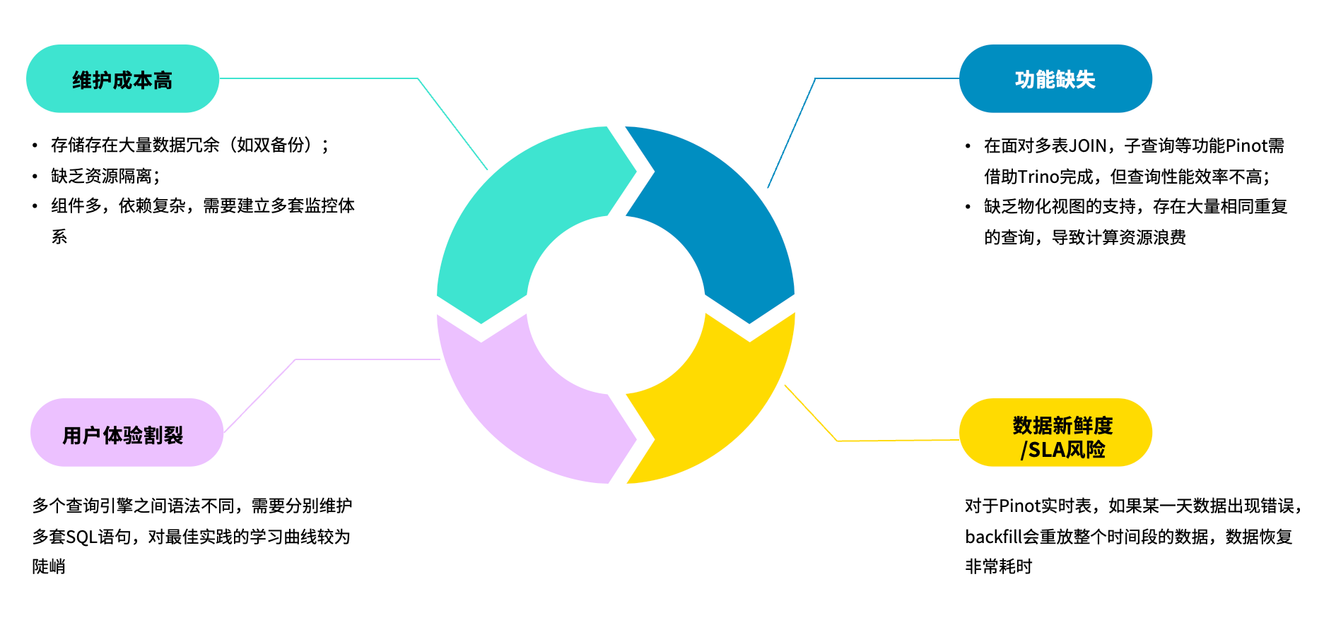 然而,这套 OLAP 技术栈在实际使用过程中也暴露出不少问题,尤其是对 Pinot 的反馈最为集中。主要痛点包括: