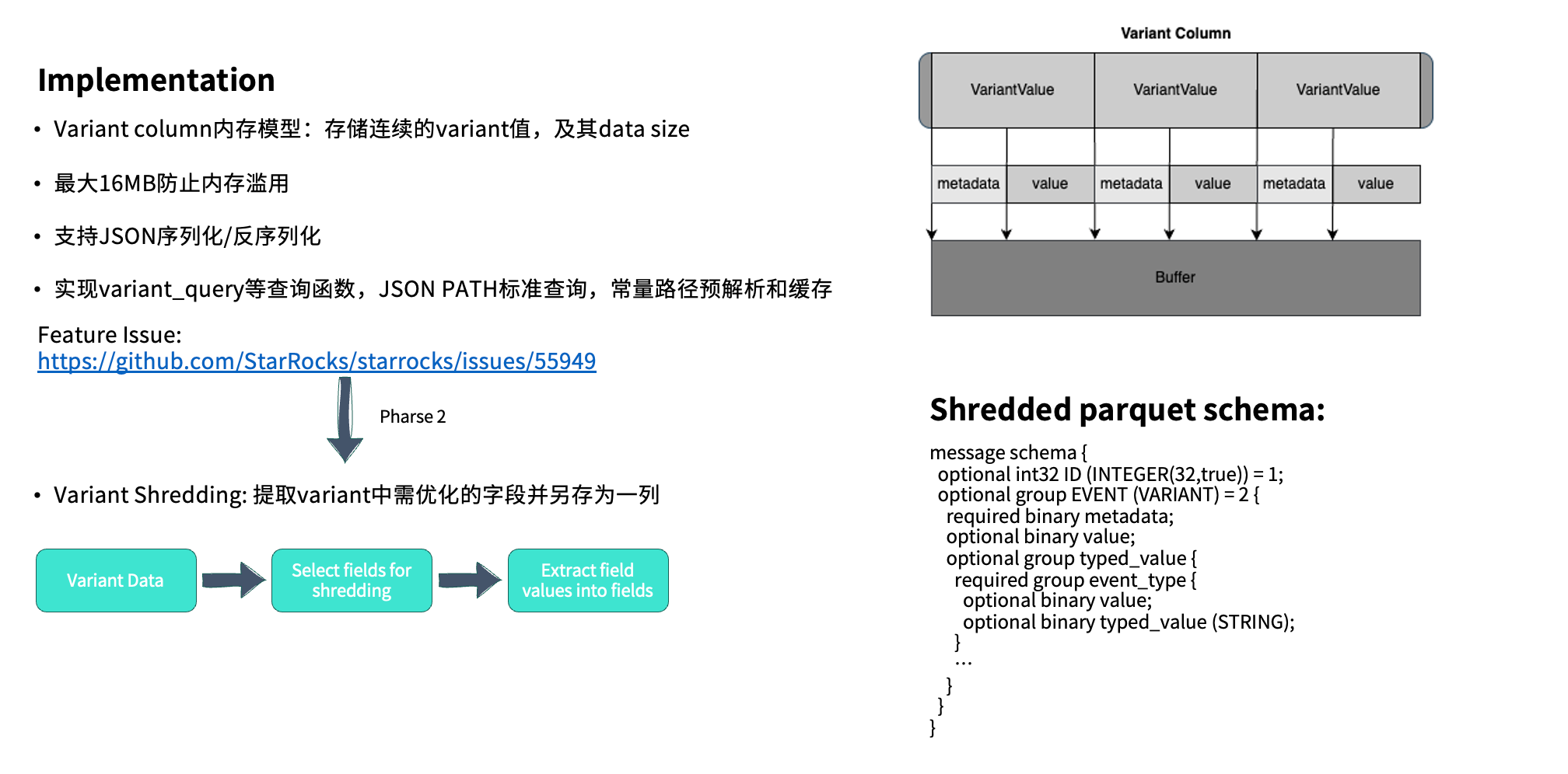 除了基础类型外,Variant 还支持 Object 与 Array 等复杂结构。以实际应用为例,当创建包含 Variant 字段的表并将数据写入 Parquet 文件时,其 Schema 结构会分为两部分(如上图右侧所示):