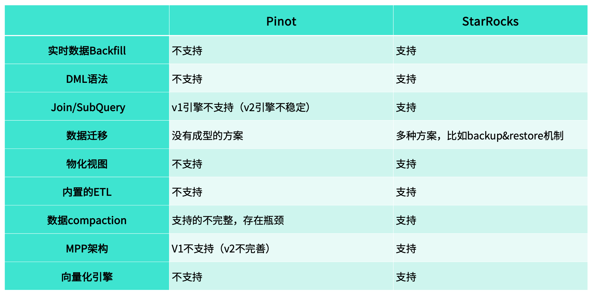 Pinot 的 V1 引擎不支持 MPP,V2 虽开始支持但稳定性较弱;而 StarRocks 原生采用 MPP 架构,分布式计算能力更成熟、性能更稳定。