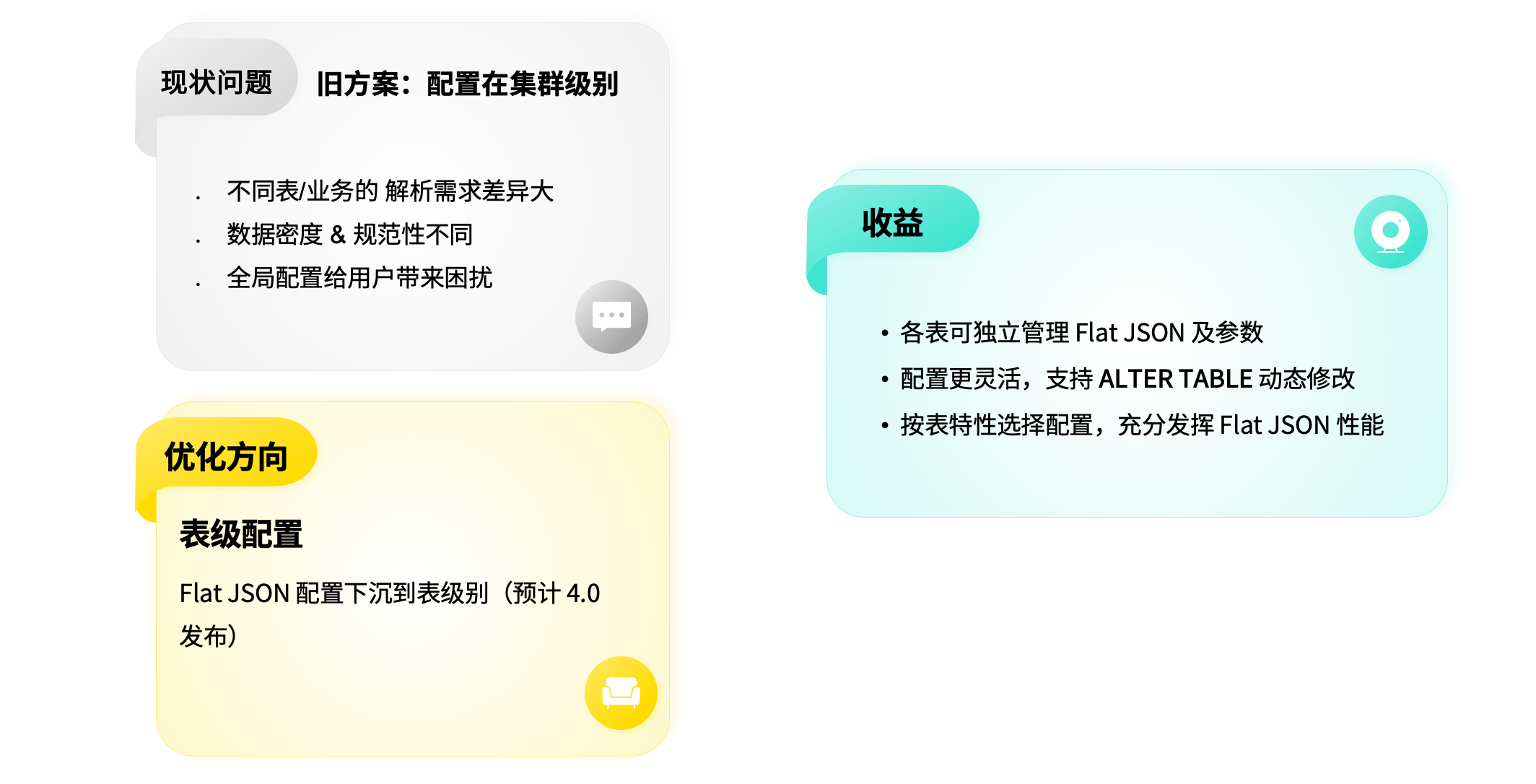 针对这一问题,我们优化了 Flat JSON 的配置机制。原先该功能仅支持集群级别配置,而现在我们将其下沉至表级别:每张表都可根据自身数据结构独立设置sparsity factor (数据稀疏度)、null factor(空值处理方式)等参数。