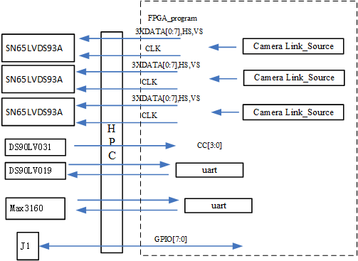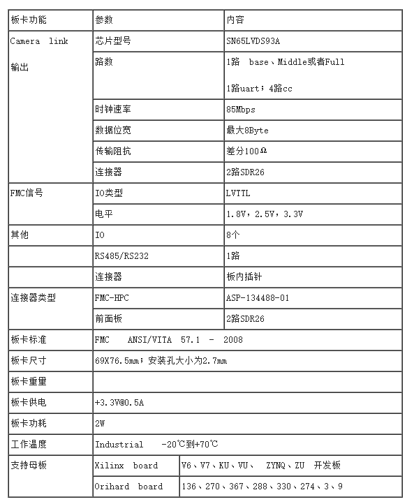 板卡提供对应FPGA载板的模拟Camera link信号输出接口程序,包括Camera link 、uart、CC信号;外部GPIO、RS232测试信号。