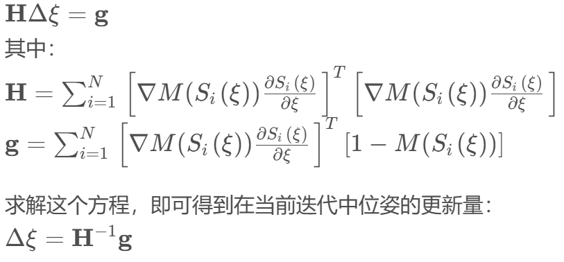 然后更新位姿估计:ξ=ξ+Δξ,重复此过程直至收敛(如 Δξ 足够小)。
