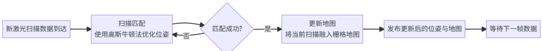 计算效率相对较高(与粒子滤波类方法比),资源消耗更可控。 | 对初值敏感。若运动过快或机器人位姿初值给得不准,易匹配失败(需IMU或运动预测辅助)。 |