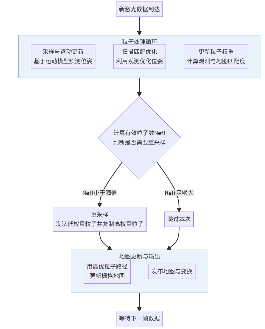 回环检测 | - | 没有显式的回环检测模块,依赖粒子多样性来闭合回环,回环过大时可能地图错位,通常需要增加大量粒子才能缓解。 |