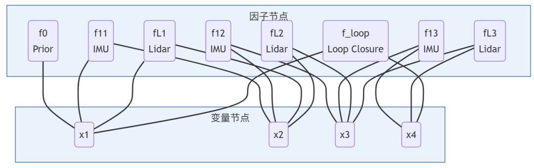 - 激光里程计因子 fₗ₁, fₗ₂, fₗ₃: 分别连接 (x₁, x₂), (x₂, x₃), (x₃, x₄),通过点云匹配提供相邻位姿间的相对变换约束。