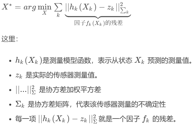 - 优化器(如GTSAM)开始工作,它要最小化所有因子的残差之和:
