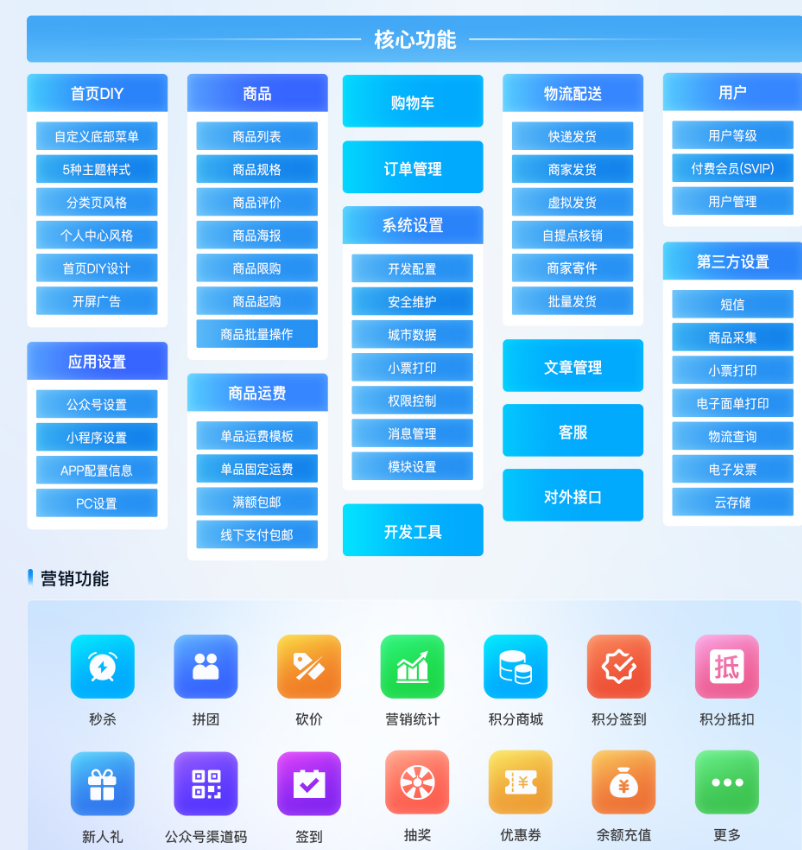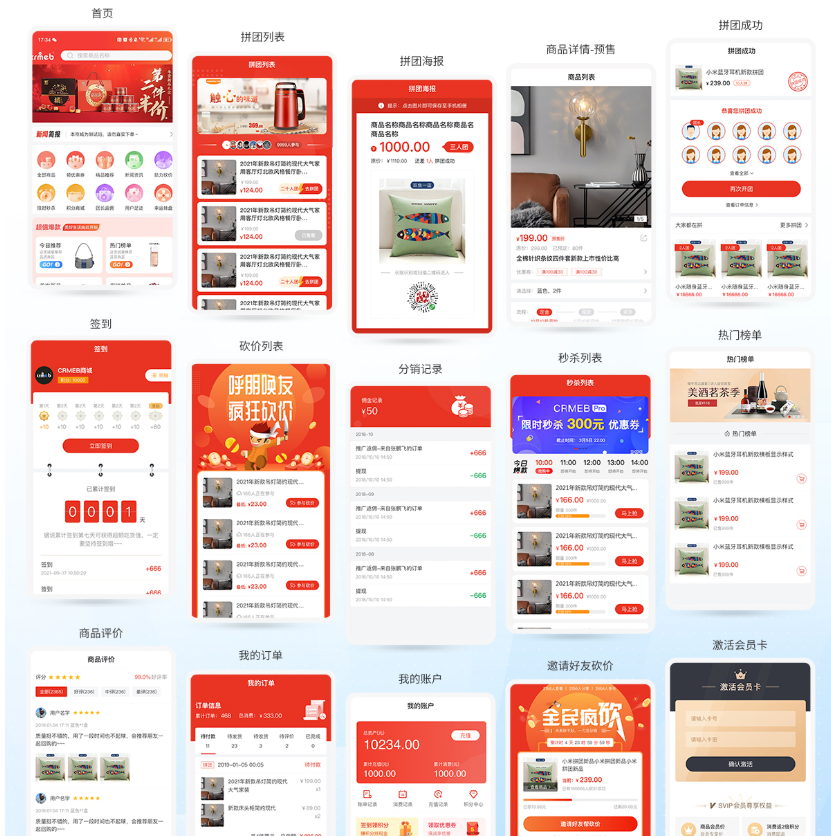 - **拉新裂变:** 拼团、砍价、分销