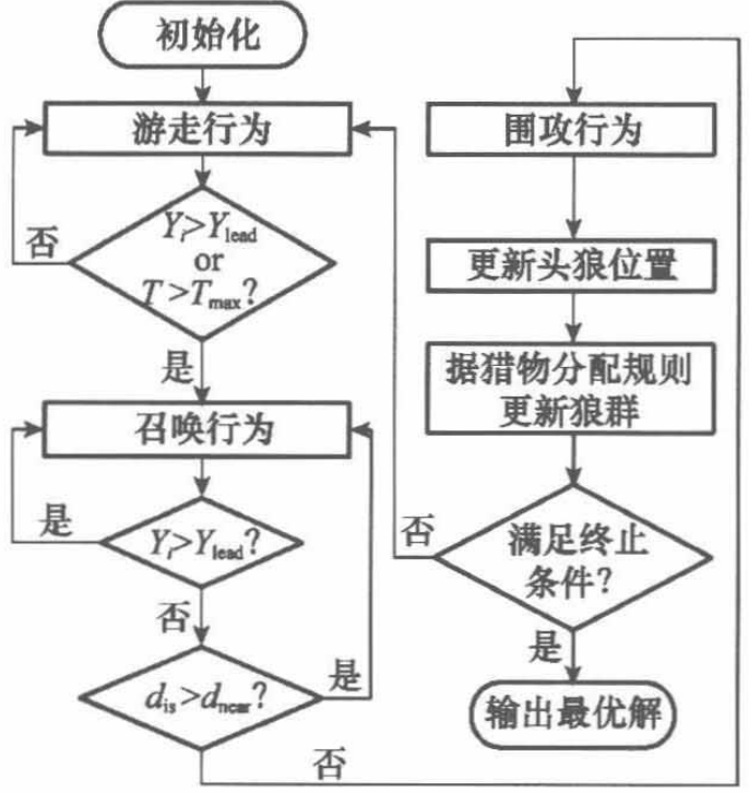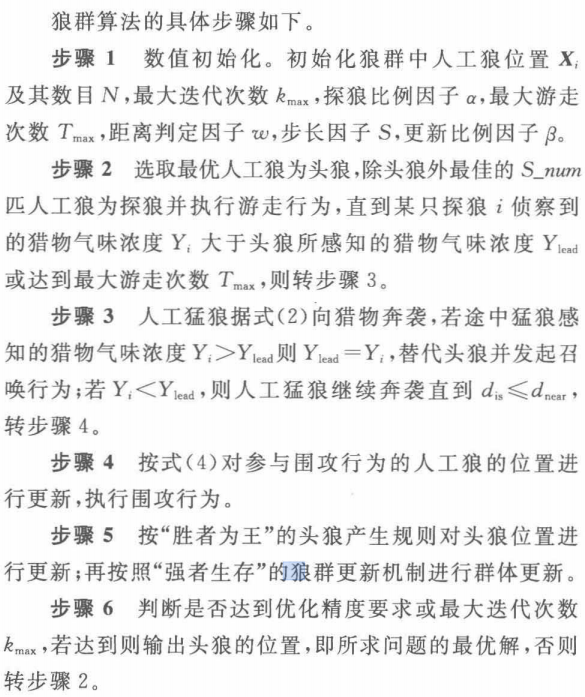 初始化 → 探狼游走 → 猛狼奔袭 → 合围攻击 → 强者生存(淘汰弱狼)