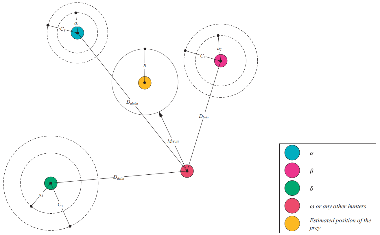 在 GWO 中,Alpha、Beta 和 Delta 狼负责估计猎物位置,其余个体根据它们的引导更新位置。具体公式如下: