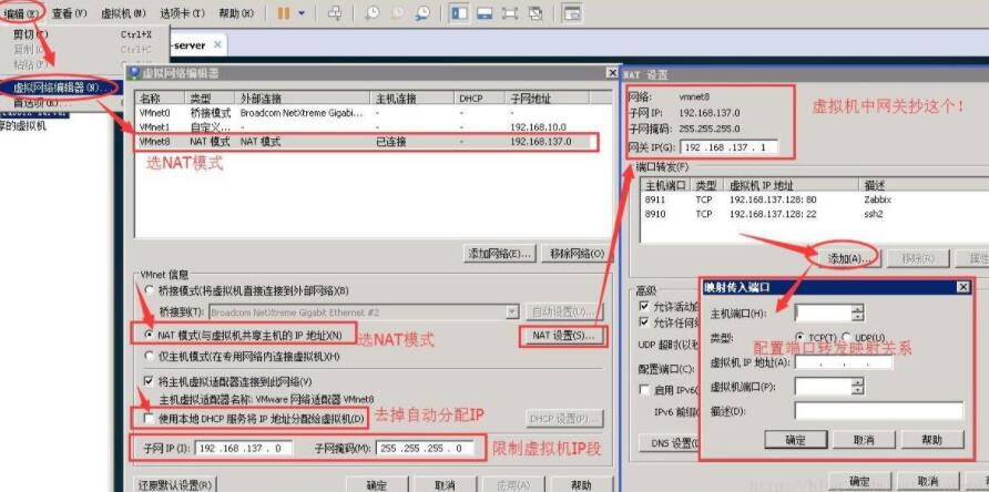 当本地网络设备数量较多时,同一段网段不能容下的环境,就需要使用虚拟机VM设置用nat模式,让宿 主机内部的VM虚拟机单独一个网段,并通过vm平台的转发端口让局域网内访问。
