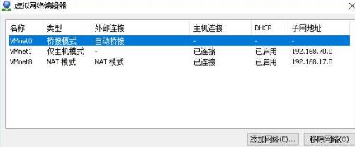 打开vmware虚拟机,可以在选项栏的“编辑”下的“虚拟网络编辑器”中看到VMnet0(桥接模式)、VMnet1(仅主机模式)、VMnet8(NAT模式)。其实,VMnet0表示的是用于桥接模式下的虚拟交换机;VMnet1表示的是用于仅主机模式下的虚拟交换机;VMnet8表示的是用于NAT模式下的虚拟交换机。
