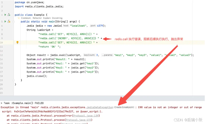redis.call() 用于执行 Redis的命令。当命令执行出错时,会阻断整个脚本执行,并将错误信息返回给客户端。