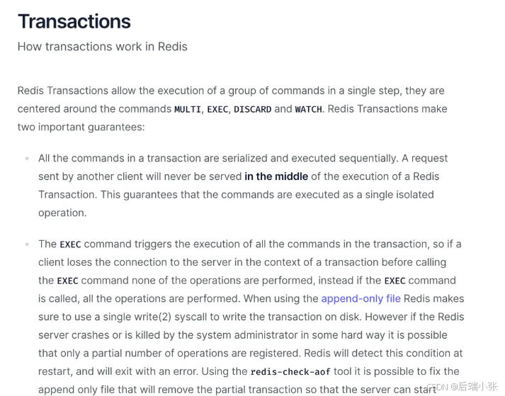 文档看起来很长,总结成一句话:Redis 事务允许执行一批命令,通过执行 MULTI命令开启事务,执行 EXEC命令结束事务,WATCH 和 DISCARD 配合事务一起使用,提供了一种 CAS(check-and-set) 乐观锁的机制。WATCH 用于监听 Key,如果被监听的 Key有任何一个发生变化,则中止事务(被动关闭事务),而 DISCARD 用于主动中止事务。