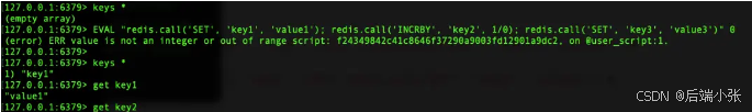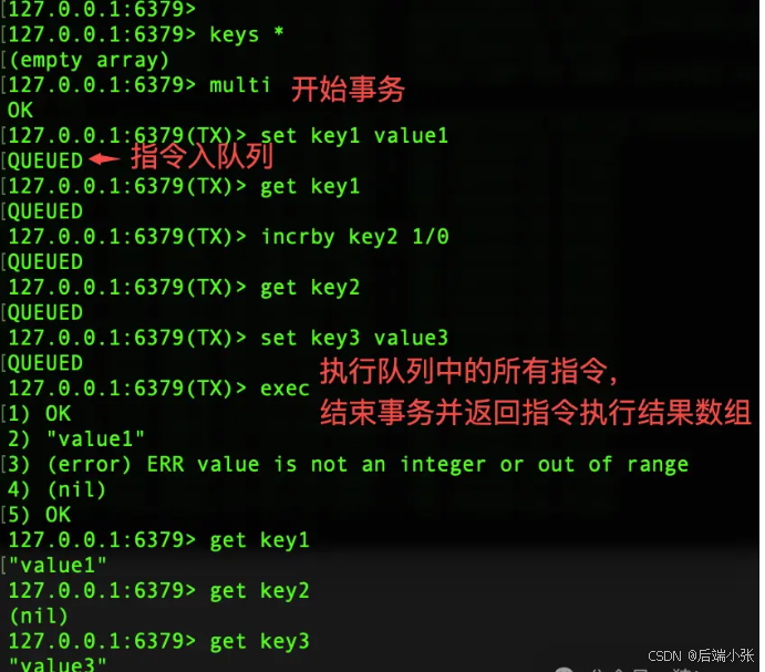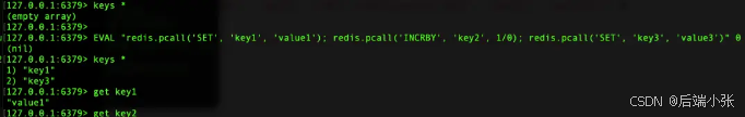 如下示例:当执行INCRBY key2 1/0 失败时,会抛异常,后续流程被阻断,即SET key3 value3没有被执行。