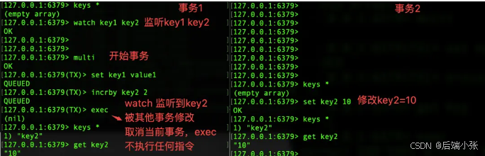 如下示例:事务1 watch key1 key2,事务2在事务1执行期间修改 key2 = 10,当事务1执行 exec命令时,因为 watch监听到 key2被其他事务(事务2)修改了(value=10) , 因此事务1被取消,事务队列中的所有命令被清除,即 set key1 value1 和 incrby key 2两条命令都不执行,key2的 value还是10;