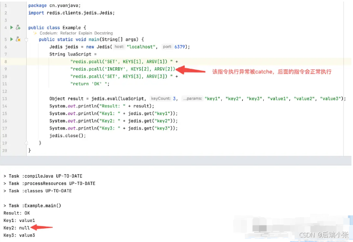 如下示例:当执行INCRBY key2 1/0 失败时,不会抛异常,后续流程继续执行,即SET key3 value3 也被执行。