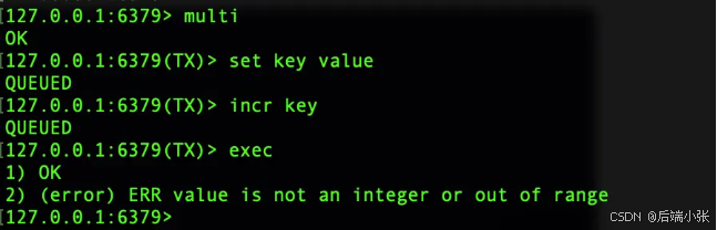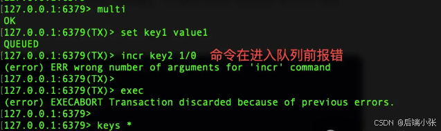 incr key2 1/0 在进入事务队列之前报错,所以,当前事务被中止,执行 EXEC命令会报错: