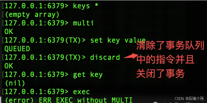 如下示例,执行 DISCARD命令后,当前事务被中止,因此,执行 EXEC 时会报“ERR EXEC without MULTI”错误。