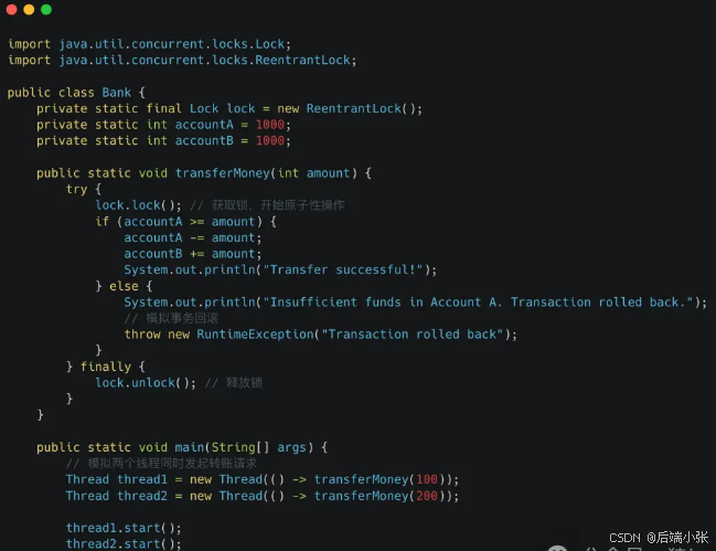 原子性是指上面两个过程,要么全部执行,要么全部不执行。也就是说,账户A 减去 100元的同时,账户B 必须增加100元,否则,该操作就不具备原子性。Java代码简要实现如下图: