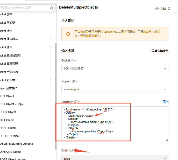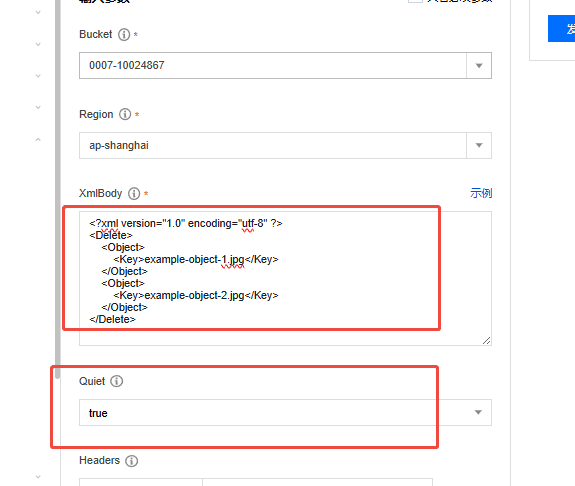 需要注意的是Quiet值为 true 启动 Quiet 模式(在响应中仅包含删除失败的对象信息和错误信息),值为 false 则启动 Verbose 模式(在响应中包含每个对象的删除结果),默认值为 false。