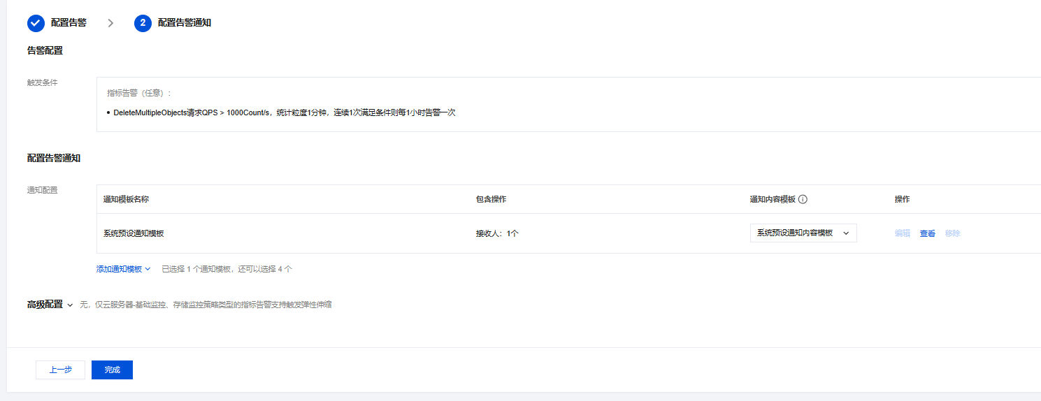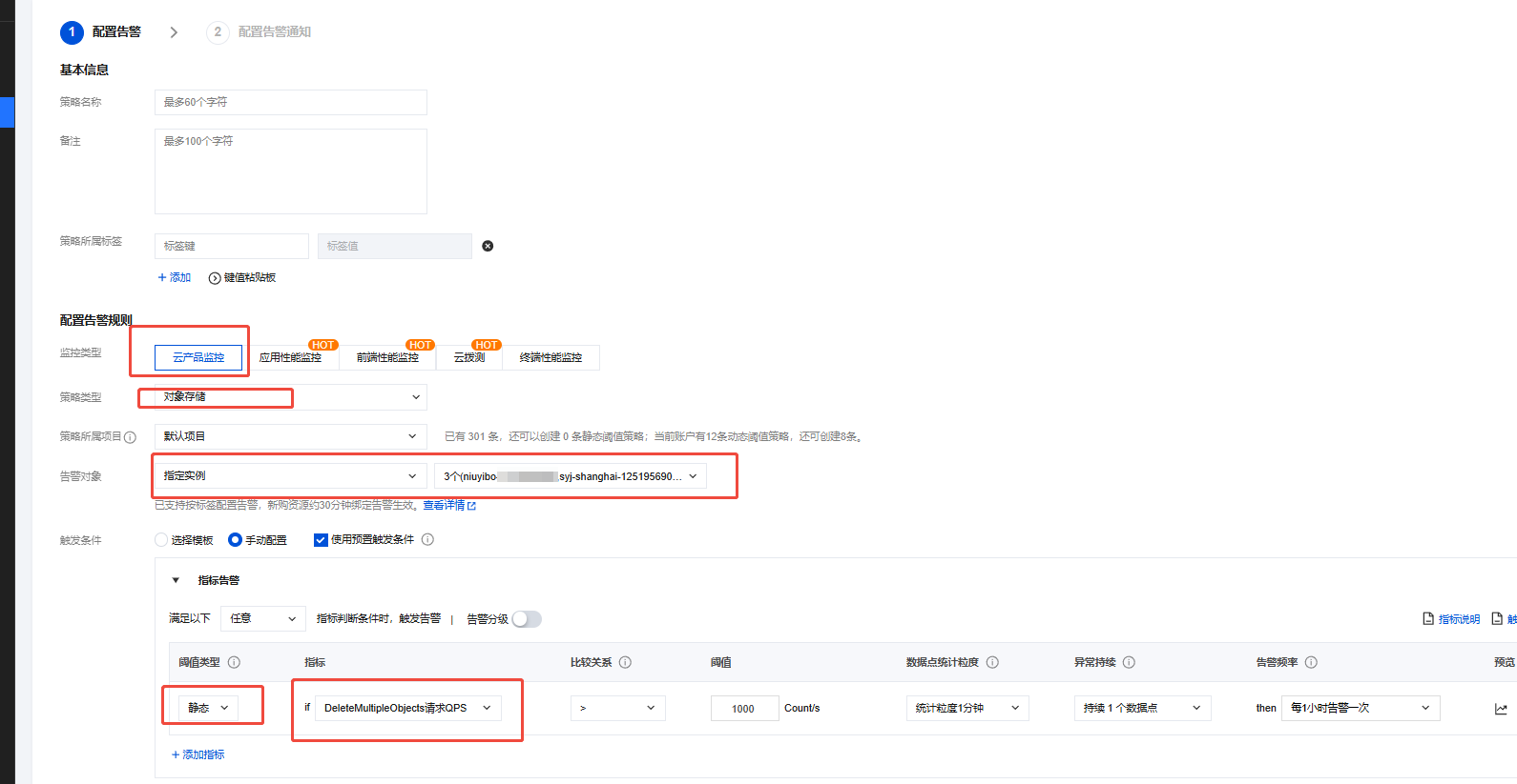 配置告警策略,可以指定多个存储桶,根据业务设置阈值,和告警频率等信息