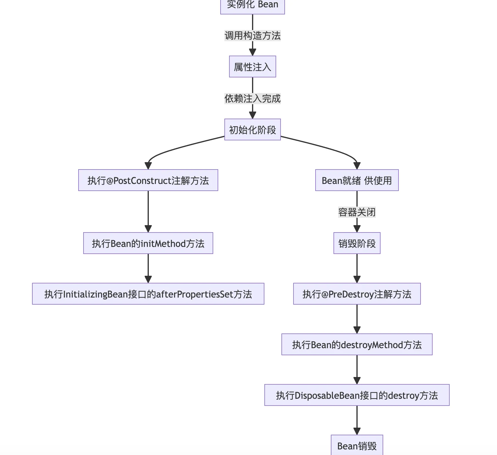 在学习注解前,我们需先明确Bean的完整生命周期。Spring Boot中Bean从创建到销毁大致分为4个阶段:实例化、属性注入、初始化、销毁。生命周期注解主要作用于初始化阶段销毁阶段。为了更直观理解,先看一张流程图:
