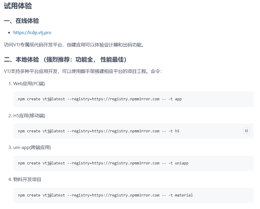 npm create vtj@latest --registry=https://registry.npmmirror.com -- -t app