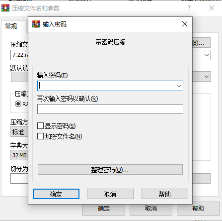在弹出的压缩文件名和参数对话框中,找到“高级”选项卡,点击“设置密码”。在“输入密码”和“确认密码”框中输入你想要设置的密码,点击“确定”,最后点击“压缩”按钮。